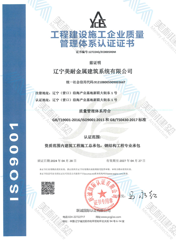 遼寧美耐金屬建筑系統(tǒng)有限公司位于遼寧(營口)沿海產(chǎn)業(yè)基地,專注于預(yù)制金屬建筑系統(tǒng)領(lǐng)域,是一家集工業(yè)建筑設(shè)計(jì)、制作、施工及相關(guān)的技術(shù)咨詢與服務(wù)為一體的綜合性服務(wù)企業(yè)。作為國家鋼結(jié)構(gòu)協(xié)會(huì)會(huì)員、中國建筑金屬結(jié)構(gòu)協(xié)會(huì)會(huì)員單位與國家高新技術(shù)企業(yè),美耐建筑集建筑工程施工總承包、鋼結(jié)構(gòu)工程專業(yè)承包等多種資質(zhì)于一身,并擁有22項(xiàng)鋼結(jié)構(gòu)建筑領(lǐng)域?qū)@?項(xiàng)軟件著作權(quán)。